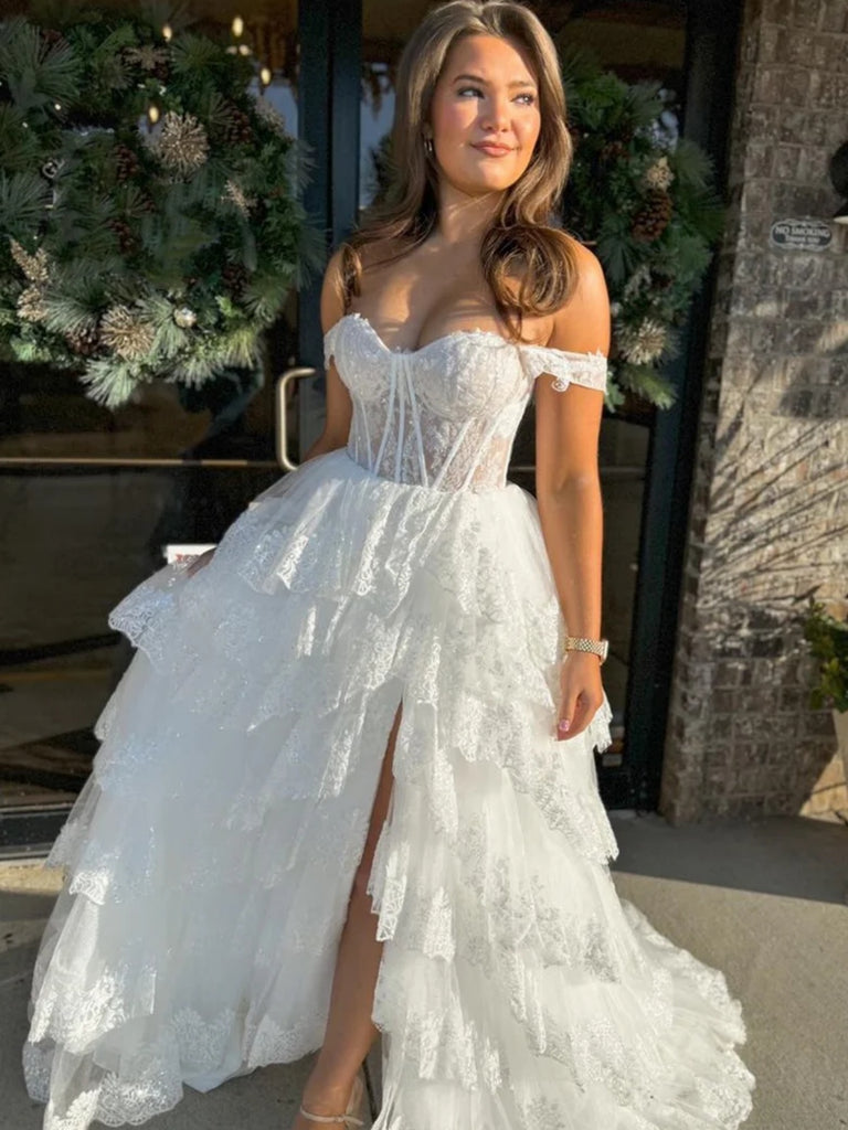 Off the Shoulder Pink Sage White Lace Layered Long Prom Dresses, Lace Layered Long Formal Dresses