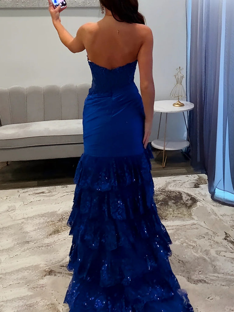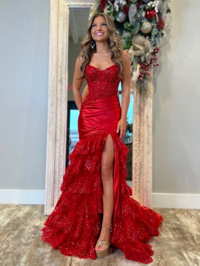 Strapless Red Blue Mermaid Lace Layered Prom Dresses, Mermaid Lace Formal Evening Dresses