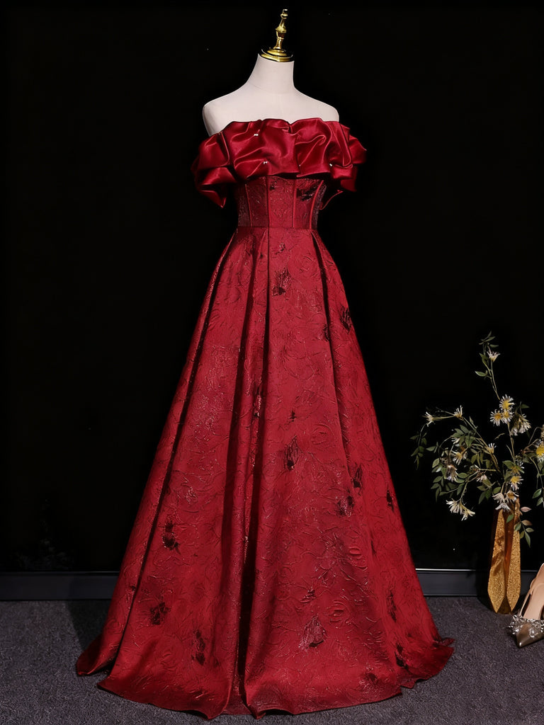 Off the Shoulder Red Beaded Satin Long Prom Dresses, Off Shoulder Red Long Formal Dresses